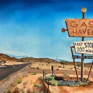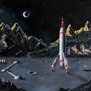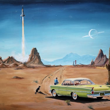This is an alternate Earth; a fantasy world where people drive to remote rocket bases in the desert and watch launches routinely. Instead of the moon on the late afternoon horizon, we see Saturn low and in the distance. Even the car is a fantasy. But of course, the owner's loyal dog is always real :) 18x24 oil on hardboard masonite. AVAILABLE (contact)